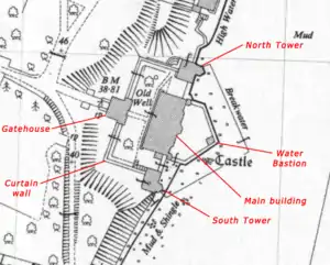 The castle's principal buildings are situated on the east side of a rectangular courtyard within which stand two large Turkey oaks, said to have been grown from acorns brought from Crimea after the Crimean War.[24] A stone curtain wall topped with brick surrounds the courtyard, standing about 1 m (3.3 ft) thick and 4 m (13 ft) high. The courtyard is entered on the north-western side through a four-storeyed gatehouse with gun embrasures for additional defensive strength.[20] It was substantially rebuilt in the 1650s after being badly damaged in a 1653 fire, traces of which can still be seen in the form of scorched stones on the first-floor walls.[24] A central gateway with a round arch leads into a passage that gives access to the courtyard. Above the gateway is a late 18th-century clock that was inserted into the existing structure. A wooden bellcote was added in the early 19th century, and a modern flagpole surmounts the building.[20]