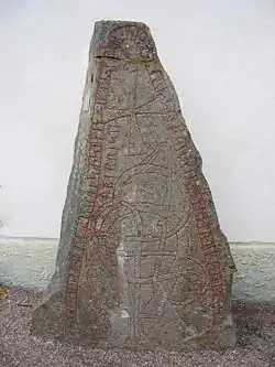 This runestone was discovered on December 5, 1947 during restoration work at the church in Alsike.[1] Before the historic significance of runestones was understood, they were often reused as materials in the construction of buildings, roads, and bridges. The stone was repaired and raised next to the church in 1948.[1] The inscription on this granite stone, which is 1.9 meters in height, consists of runic text in the younger futhark carved on a serpent that is intertwined in an intricate design. In the upper center of the design is a Christian cross. The inscription is classified as being carved in runestone style Pr5, which is also known as Urnes style. This runestone style is characterized by slim and stylized animals that are interwoven into tight patterns. The animal heads are typically seen in profile with slender almond-shaped eyes and upwardly curled appendages on the noses and the necks.