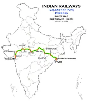 It operates as train number 22909 from Valsad to Puri and as train number 22910 in the reverse direction serving the states of Gujarat, Madhya Pradesh, Chhattisgarh, and Odisha.[3][4]