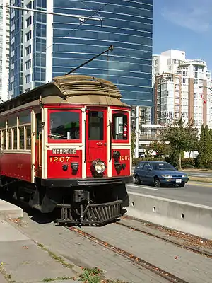 Service was inaugurated on July 29, 1998, and was considered to be a demonstration project for a modern downtown streetcar system that the city plans to develop.[1] It continued to operate almost every summer through 2011, as an excursion-oriented historic electric railway line. In 2010, the heritage service did not operate, with the line from west of Olympic Village used for a modern-streetcar demonstration service known as the "Olympic Line" (see section below). Temporary modifications made to the overhead wire took longer than expected to undo, delaying the start of 2011 service, with the service starting on July 1 and scheduled to run mid-October.[2] The line did not operate in 2012,[3] and service suspended indefinitely due to financial constraints with no set plans to resume operation.[4] Furthermore, a Vancouver City Council report published in March 2014 recommended against reviving service on the heritage line.[5]
