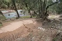 Upturned beds are mounds of elongated sediment that are deposited on the lee (downflow) side of an obstruction, containing form-concordant stratification.[2][3] These may also be described as tongue shaped.[4] These beds are formed where plants were once standing and caused a decrease in bed shear, allowing sediment to deposit near their base.[2] This commonly occurs with meandering flow that deposits sediment on the lee side of a plant. Sediment is also accumulated on the front and sides of an obstruction when deposition is high. The presence of upturned beds in cross-section is consistent with modern vegetation shadows.[1]