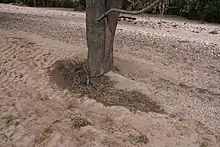 Bodies of fine to very fine grained sand that fill symmetrical, cone shaped, depressions centered on tree trunks by swirling flood water. The fill is generally organized into form-concordant, concentric laminae that dip towards the tree.[5] Centroclinal cross strata form from the infilling of scours created around trees by swirling flood water.[5] Studies and piers show us just how the scouring process works. In front of these piers, decelerating flow and friction with the bed material causes a downward pressure gradient that leads to erosive downflow.[2] Downflow is accompanied by horseshoe shaped sediment deposits that generate a U-shaped scour around the front and sides of the obstruction.