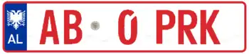 Test Vehicle registration plates in Albania have red borders and red texts on a white background. They follow the format [AA 0 PROV], where PROV stands for Provë which means Test.