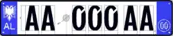 A new format similar to the post-1994 Italian and post-2009 French plate designs has been introduced since 16 February 2011.[1] The plates start with a blue strip at the left with 'AL' and redesigned double-headed eagle in white, 2 serial letters, security hologram, 3 digits, 2 serial letters on a rectangular white background, and end on the right with a blue strip that's supposed to show year of registration and regional code in white on. It has been observed that the last two identification elements are de facto not included while the font is more emphasized than the post-2002 one.[2] Plates of all vehicles would experience a similar change.[3] Critics claim that the color of the double headed eagle and strip is not representative of red and black colors of the Albanian flag.