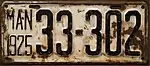 1925 Embossed black serial on white plate with border line; "MAN 1925" at left 12-345 1 to approximately 41-500