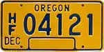 For-Rent | Blue on gold; "OREGON" at top and "DEC." and year of expiration at bottom | F/R 1-2345 | Issued to trailers having a loaded weight of 8,000 lb or less that are for hire and are equipped with pneumatic tires. All plates expire on December 31 of the stated year. | ||