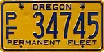 Permanent Fleet | c. 1973–2004 | Blue on gold; "PERMANENT FLEET" at top and "OREGON" at bottom | P/F 12345 | P/F 00001 to approximately P/F 27000 | Issued to owners of fleets of 50 or more vehicles used within Oregon. Fleet vehicles can be passenger cars, trucks, buses or utility trailers. |