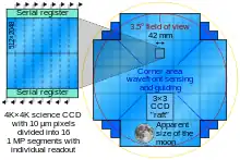The camera focal plane is flat and 64 cm in diameter. The main imaging is performed by a mosaic of 189 CCD detectors, each with 16 megapixels.[45] They are grouped into a 5×5 grid of "rafts", where the central 21 rafts contain 3×3 imaging sensors, while the four corner rafts contain only three CCDs each, for guiding and focus control. The CCDs provide better than 0.2 arcsecond sampling, and will be cooled to approximately −100 °C (173 K) to help reduce noise.[46]