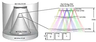 | Telescope style | Three-mirror anastigmat, Paul-Baker / Mersenne-Schmidt wide-angle[8] |