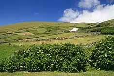 The Vila do Corvo is implanted along the maritime coast of the island of Corvo, and represents the only inhabited settlement on the island.[4] With a perimeter of 17 kilometres (11 mi), the settlement is dominated by the sheer cliffs of the extinct volcanic crater of the Caldeirão, which extend 718 metres (2,356 ft) above sea level.[4] The urban area covers an incredibly small 6.5 metres (21 ft) by 3 metres (9.8 ft) on an ancient debris field in the south, along the cove of Nossa Senhora do Rosário.[4] The landscape north of the settlement is characterized by agricultural fields and pastureland, divided by stone walls.[4]