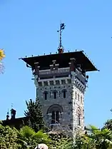 The building features an eclectic style that combines Gothic Revival and Art Nouveau elements. Light stone, bricks and wood are used in the façades in the decoration. A large tower with biforas crowned by a loggia characterizes the façade overlooking the lake.[1][2]