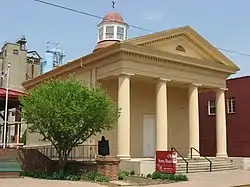 The Old State Bank is the oldest existing bank structure in Indiana[11]. On Feb. 13, 1834, the Indiana General Assembly chartered the Second State Bank of Indiana, with headquarters in Indianapolis and 12 branches across the state.[4] Construction of the bank in Vincennes began in July 1838. The bank moved into this building upon its completion in November 1838 having been previously located in a rented space on First Street between Main and Vigo Streets.[4] The bank's facade is an imitation of the front of a Greek temple; this distinctive design known as the Greek Revival Style.[5] The style is carried over into the main room of the bank where six fluted columns, more than 30 feet tall, support a bell-shaped cupola that admitted light into the main room.[5] Given the proximity to the Wabash River, Vincennes was a strong fur-trading location early in Indiana’s history and the bank's charter allowed it to take furs and produce in exchange for cash.[5] The Old State Bank helped transform Indiana from a fur-trade to agricultural economy and was a key establishment in settling the Midwest.[11]