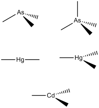 The initial studies have focused on understanding the binding of these heavy metals to peptides. Arsenic (As), mercury (Hg), and cadmium (Cd) all were used in systems with various peptides. Arsenic was found to bind to peptides via primarily a trigonal-pyramidal or tetrahedral shape in a manner that is both kinetically and thermodynamically favorable.[22] Mercury on the other hand was found to bind to two sulfur atoms in separate peptides via a linear shape, thus causing the formation of a two strand coiled coil.[23] It was also shown that under certain conditions, termed stepwise aggregation-deprotonation, mercury can be made to bind three sulfurs thus yielding a three strand coiled coil with an Hg in the middle.[24] Cadmium was the last heavy metal studied in these systems. It was found that Cd also binds to three separate sulfurs, though it does not resemble the Hg system in that it does not form a linear binding shape within a two strand coiled coil.[25] This information obtained gives valuable information on how these heavy metals interfere with proteins and their folding. This is the first step in understanding and potentially, solving heavy metal binding in the body.