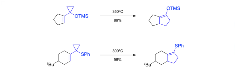 It was found that siloxyvinylcyclopropanes[31] as well as the analogous sulfinylvinylcyclopropanes[32] could be used as substrates to build annulated cyclopentene structures. Albeit these reactions still required reaction temperatures above 300 °C they were able to make useful products arising from the annulation of cyclopentene to a present ring system.