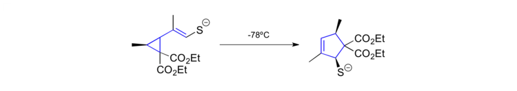 Another intriguing result was reported by Larsen in 1988.[38] He was able to promote vinylcyclopropane rearrangements with substrates such as the one shown in the reaction below at temperatures as low as -78 °C. The substrates were generated in situ upon ringcontracting thiocarbonyl Diels-Alder adducts under basic conditions. This methodology allowed the formation of numerous highly functionalized cyclopentenes in a stereoselective manner.
