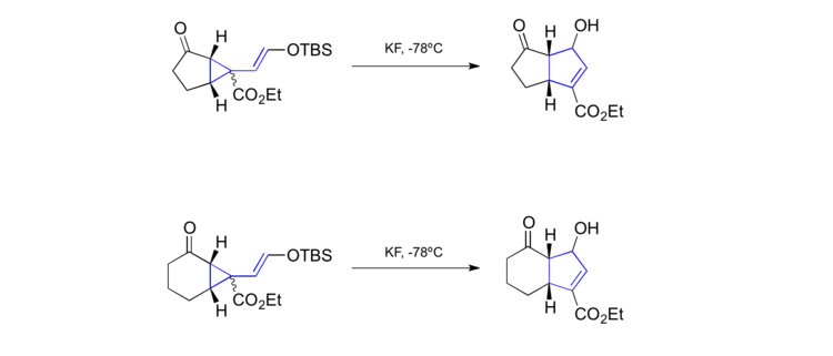 A synthesis of Aphidicolin use methodology around the vinylcyclopropane rearrangement developed in their own laboratory .[40] A key step converts a late stage siloxyvinylcyclopropane into a cyclopentene that contained the [6-6-5]-fused carbon skeleton found within the natural product. The rearranged product into the natural product by further manipulations.