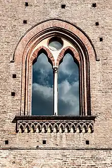 One of the two four-light windows of the south-eastern loggia restored to its original shape; on the background, the four-light windows of the south-western side