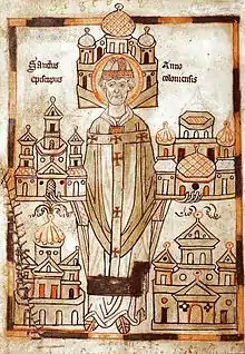 Miniature on the first page (fol. 1v) of the Vita Annonis Minor showing the standing figure of Saint Anno in bishop's robes with chasuble and pallium, surrounded by his religious foundations: in his hands the churches of St. Maria ad Gradus (1057) and St. Georg (1067) in Cologne, at his feet the Benedictine abbeys of Saalfeld in Thuringia (1063) and Grafschaft in Sauerland (1073), and at his head the Benedictine abbey of Siegburg (1064)