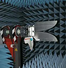 A single-piece sheet metal Vivaldi antenna being tested in an anechoic chamber