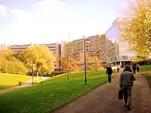 Most of the faculties are located on the Etterbeek campus (which is actually located on the territory of the neighbouring borough of Elsene). It is the livelier of the two campuses and consists almost entirely of concrete structures, most built in the 1970s. Some are decaying rapidly but at least one, the Rectoraat designed by Renaat Braem, is heritage-listed.[31] Activities take place in numerous auditoriums and labs. In addition, there is a modern sports centre, a football pitch encircled by a running track, and a swimming pool. For eating out, there is a restaurant with subsidies for students and staff, and the bars/cafes 't Complex, Opinio, and KultuurKaffee. The KultuurKaffee was a full-fledged concert venue during the evening/night, offering the university a cultural scene and organising free concerts and events. It was demolished to make space for the new XY construction project in 2015.[32]