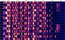 JT6M, introduced in late 2002,[7] is intended for meteor scatter and other ionospheric scattering of signals, and is especially optimized for the 6-meter band. The mode also employs multiple frequency-shift keying, but at 44 tones. One of the tones is a synchronization tone, leaving 43 tones to carry data (one tone per character in the character set, which includes alphanumerics and some punctuation). The symbol rate is 21.53 baud; the actual data rate as encoded for transmit is 14.4 characters per second. The mode is known for sounding "a bit like piccolo music".[7]