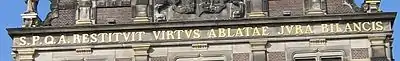 Atop the façade of the building is the Latin proverb: "SPQA RESTITVIT VIRTVS ABLATAE JVRA BILANCIS". This means : SPQA (Senatus PopulusQue Alkmaris - Council and People of Alkmaar) by virtue of its courage and strength, restored the rights to the balance to the people and government of Alkmaar." This refers to a battle against Spanish Roman Catholics, which, upon the truce of October 8, 1573, established the rights of the citizens to have a weigh house.