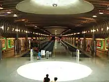 The station has five platforms and is constrained by the 9.3 m width of the 426 m long double-track access tunnel. Early forecasts predicted that while double-tracking of the surrounding rail network would improve peak time train congestion, the capacity of the corridor would not be reached until about 2020.[37] Growth in train patronage and increased services resulted in the tunnel being at maximum capacity from 2011, almost 10 years earlier than predicted.[38] Because of the capacity restrictions, a proposed Hamilton-Auckland commuter train service would have gone to The Strand Station some 1.5 km to the east.[39]