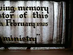 - c.1952, “Peter Scott Martin Memorial Stained Glass Window” with Clokeys of Belfast maker’s mark, second window to left of north nave wall in St. Eugene's Church of Ireland Church (Ardstraw Parish Church) (1724), Newtownstewart, County Tyrone, Northern Ireland BT78 4AA[7][8]