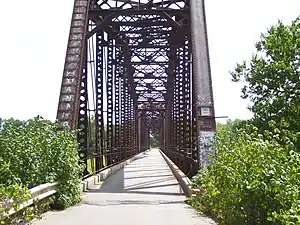 The bridge was built in 1902 by the American Bridge Company[2] to serve as a rail bridge connecting Pauls Valley with Shawnee.[3] It was later converted to a one-lane bridge for auto traffic. The bridge is of the camelback truss design and is composed of three spans, each 265 feet (81 m). Each of these spans are the longest in Oklahoma.[2]