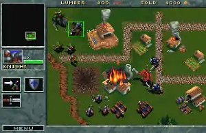 Warcraft: Orcs & Humans is a real-time strategy game (RTS).[4][5][6] The player takes the role of either the Human inhabitants of Azeroth, or the invading Orcs.[7][8] In the single player campaign mode the player works through a series of missions, the objective of which varies, but usually involves building a small town, harvesting resources, building an army and then leading it to victory.[4] In multiplayer games, the objective is always to destroy the enemy players' forces. Some scenarios are complicated by the presence of wild monsters, but sometimes these monsters can be used as troops.[9][10][11] The game plays in a medieval setting with fantasy elements. Both sides have melee units and ranged units, and also spellcasters.[5]