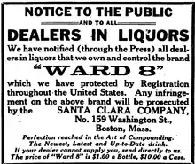 In 1898 Democratic political czar Martin M. Lomasney hoped to capture a seat in the state's legislature, the General Court of Massachusetts. Lomasney held considerable power in the city for nearly 50 years. The story goes that the drink was created to honor his election, and the city's Ward 8 which historically delivered him a winning margin.[2] In 1915 the Santa Clara Company registered "Ward 8" as a trademark with the United States Patent Office claiming use since November 1912 [3] and published a notice that they would prosecute any infringement.[4] During prohibition the Daily Boston Globe reported that the drink was believed to have originated at the "old" and abandoned Quincy House.[5] Competing but unfounded myths abound in print and on the Internet. One story reports that it originated in New York in an area known for political corruption, another that the cocktail is a traditional drink of the Scots Guards.