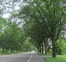 The original allée was planted in the mid-1920s by Princeton Nurseries, at one time the country's largest commercial plant nursery.[2] The Elm trees are of the Princeton variety, developed by Princeton Nurseries for its landscaping quality, and are resistant to Dutch elm disease, the only one of ten resistant cultivars to have trees that have reached maturity.[3] Of the original 136 Elms planted in the 1920s only 76 survive. They are approximately 24–26 inches (610–660 mm) in diameter and 60 feet (18 m) tall. Their branches meet over the roadway to provide a leafy canopy. The allée has many replacement trees, including 16 Norway maples planted in the 1960s, and 31 Liberty elms planted in 1995. The secondary rows of Delaware Elms were planted in 1983, and a long row of forsythia to the east is thought to date from the late 1960s.[4]