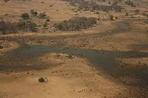 The arable lands in the south-eastern fringes of the delta, that become dry after the floods recede (these are locally known as molapo's), often have a sandy topsoil. In depressions, the topsoil may be thin or missing altogether, exposing a heavy clay soil.
