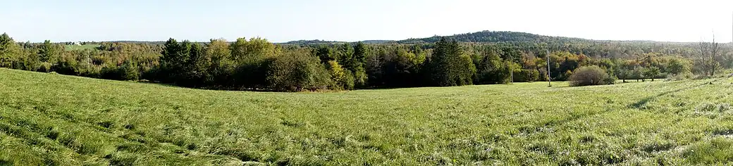The first European inhabitant of the community was George "Michael" Wile (grandson of Frederick "Weil", who arrived in 1750 on the ship Ann[4][5] and his wife, Lucinda Salome Hirtle (great granddaughter of Hans Michael Hirtle who came in 1751 on the ship Pearl), Michael Hirtle's daughter from nearby Newcombville. Michael Wile's grant of 170 acres (0.69 km2) included the highest drumlin in the area, overlooking Mack Lake (later renamed "Matthew Lake"), which he cleared to build his home and break up for cropland.