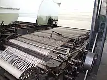 Attached to the weaving shed in a typical mill would be a boiler house where the steam was raised,[6] an engine room housing a stationary steam engine[7] and a two or three-storey building where the preparatory processes were done below and above would be the warehouse. This also housed the offices. Weaving was not possible without a continuous supply of weft on pirns, and beams carrying the warp. Starting with the warp, it had to be warped from creels of thread, in a multistage process onto the weavers' beam. This could be done in the mill or the warp could be bought in and delivered on the tapers beam. The beam of thread had to be sized in a tape sizing machine by sizers.[8]