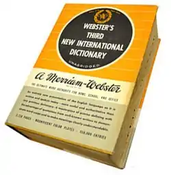 Webster's Third New International Dictionary of the English Language, Unabridged (commonly known as Webster's Third, or W3) is an American English-language dictionary published in September 1961. It was edited by Philip Babcock Gove and a team of lexicographers who spent 757 editor-years and $3.5 million. The most recent printing has 2,816 pages, and as of 2005, it contained more than 476,000 vocabulary entries (including more than 100,000 new entries and as many new senses for entries carried over from previous editions), 500,000 definitions, 140,000 etymologies, 200,000 verbal illustrations, 350,000 example sentences, 3,000 pictorial illustrations and an 18,000-word Addenda section.
