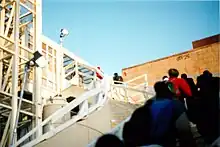 The original incarnation of the Liberty Street Bridge (40°42′38″N 74°0′53″W / 40.71056°N 74.01472°W), was called the South Bridge, as it was seen as a companion to its Vesey Street counterpart and had a similar design. Due to the attacks, it had sustained significant damage. However, unlike its counterpart, it was extended and repaired and was reopened in April 2002.[16] Since then, the bridge has been revamped and rerouted, due to its location near the World Trade Center site and the construction activity for the Vehicle Security Center and the demolition of the Deutsche Bank Building at 130 Liberty Street. On April 21, 2010, the eastern bridge access point was shifted onto the east side of West Street, from Liberty Street. A pre-fabricated segment was attached to the existing bridge, for use while construction proceeds on both sides along Liberty Street. The new pre-fabricated southward extension was fitted with an elevator for ADA accessibility.[17] The bridge was connected to Liberty Park at its eastern end in 2016.[18]
