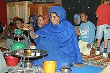 • Tea is more than just a drink for the Saharawi people. It is a way to meet with friends and family to share moments of conversation and friendship. It usually follows a ritual, in which are taken three vessels. In this regard, there is a popular comment: "The first glass of tea is bitter like life, the second cup sweet like love and the third soft as death."[2]
