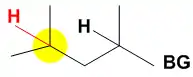 In the case where a bulky group, denoted at the right by BG, is present near multiple aliphatic C-H groups that are electronically equivalent, the bulky White–Chen catalyst will target the less sterically hindered C-H bond. In the case at the right there is a large bulky group in close proximity to one of two aliphatic C-H bonds. The C-H bond shaded in yellow is further from the bulky group, is less sterically hindered, and will therefore be the site of oxidation by the catalyst in this case. The bulky nature of the White–Chen catalyst allows product predictability based on steric properties of the starting materials given that electronic properties are equivalent.