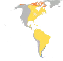 They are a long-distance migrant, wintering in southern South America and the Caribbean. They are considered one of the most extreme long-distance migrants in the world,[10] traversing the entire continent of North America in the span of one month.[2]