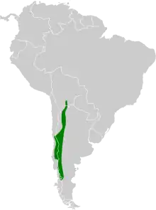 The white-sided hillstar is found in the Andes from central Bolivia's Cochabamba Department south through Chile to the Biobío Region and Argentina as far south as Santa Cruz Province. It inhabits puna grasslands with dwarf shrubs, cacti, and Puya. In elevation it generally ranges from 1,200 to 4,000 m (3,900 to 13,100 ft) but may go higher even to the snow line.[7]
