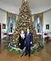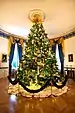 2016 | Douglas fir, Oconto, Wisconsin[49] | This Blue Room tree celebrates "We the People". It is decorated with ribbon garland featuring iconic words of the Preamble to the United States Constitution. Ornaments featured images of American families, farmers, and service members, reflecting the United States by diversity and strengthened by a shared spirit of hope and optimism.[50] | Michelle Obama | Blue Room | The Gift of the Holidays[51] |