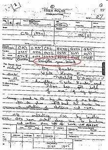 One log shows that Jeremy rang the local police station and spoke to police constable Michael West in the information room.[94] As a result West began an "event log".[95] This states that Jeremy's call came in at 3:36 am on 7 August 1985. Jeremy maintains that he telephoned ten minutes after his father phoned him. But at trial it was accepted that West had misread a digital clock and that the call had probably come in just before 3:26 am, because that was when West asked a civilian dispatcher, Malcolm Bonnett, to send a car to the scene. The car, Charlie Alpha 5, was dispatched at 3:35 am.[96][lower-alpha 5] The event log noted a call from: