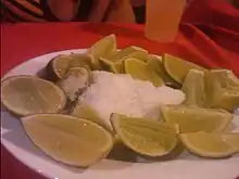 Outside Mexico, a single shot of tequila is often served with salt and a slice of lime or lemon. This is called tequila cruda and is sometimes referred to as "training wheels", "lick-sip-suck", or "lick-shoot-suck" (referring to the way in which the combination of ingredients is imbibed). The drinkers moisten the back of their hands below the index finger (usually by licking) and pour on the salt. Then the salt is licked off the hand, the tequila is drunk, and the fruit slice is quickly bitten. Groups of drinkers often do this simultaneously. Drinking tequila in this way is often erroneously called a Tequila Slammer,[52] which is in fact a mix of tequila and carbonated drink. Though the traditional Mexican shot is tequila by itself, lime is the fruit of choice when a chaser must be used.[53] The salt is believed to lessen the "burn" of the tequila and the sour fruit balances and enhances the flavor. In Germany and some other countries, tequila oro (gold) is often consumed with cinnamon on a slice of orange after, while tequila blanco (white) is consumed with salt and lime.