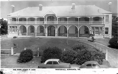 Sorrento became a popular holiday destination when paddle steamers began regular trips across Port Phillip Bay from Port Melbourne in 1875. The 'back beach', across the narrow peninsula facing the ocean became accessible in 1890 when a steam tram operated from there to the Sorrento foreshore and pier.[1] At the same time the large Back Beach Palace was built at the terminus, facing the beach.[2] It was joined in 1904 by the Whitehall Guesthouse across the road, built for James Dunlop Allen, who ran it with his daughter until 1949.[3][4] Whitehall was one of many guesthouses in Portsea and Sorrento, but by the 1950s it was the last one operating in Sorrento.