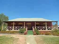 The house remains today as an extended dwelling of brick and iron construction with rendered arches to door and window openings, brick chimneys and casement windows. The front verandah has timber posts and colonial style cross-cross balustrading.[2]