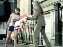 As the woman moves, her actions control everyone around her; an old man moving side to side with a TV, another young man on his cell phone and an Asian man crossing the street while preoccupied with reading a magazine. The young woman makes a mistake and takes too many steps and watches as she causes the Asian man to be hit by a Plymouth Reliant car. Shocked, she tries retracing her steps and starts back at where the grocer tosses her the fruit and takes a few steps to the side and starts walking again. Since it is not the same path as the first time, the events have changed. Instead of her catching the fruit, the man on the cell phone is instead, hit by it and he drops his phone. As he bends down to pick it up he accidentally kicks it into the path of a bicycle that has to swerve to miss him but instead nearly hits the old man with the TV and causes him to drop it.