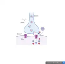 Figure 4. Kainate receptor activation by a ligand. Glutamate (red) is released from vesicles on the presynaptic membrane. This release is mediated by presynaptic kainate receptors. The ligand (such as willardiine), and an external ion (such as sodium) bind to a postsynaptic kainate receptor and opens the ion channel, allowing the influx of sodium and calcium ions.[3]
