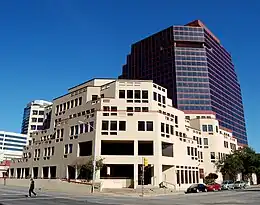 The complex, originally named Republic Plaza, was developed by Austin developers Watson-Casey Companies, originally envisioned as the first phase of a 60-acre urban renewal project for Austin's Warehouse District.[1] The unbuilt redevelopment's master plan, designed by urban planner Denise Scott Brown, would have included a new city hall for the city of Austin and a new location for the Laguna Gloria art museum, designed by architect Robert Venturi.[3]
