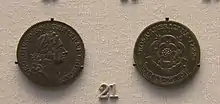 Wood's coinage was extremely unpopular in Ireland. The Anglican archbishop of Dublin, William King, was an early critic of the copper coinage scheme, arguing as early as July 1722 that its introduction would lead to an outflow of gold and silver coins from the kingdom.[12] The Commissioners of the Irish Revenue similarly argued that there was no shortage of halfpence and farthings in Ireland, and a large influx of copper coins would be prejudicial to the country's commerce and the royal revenue.[13] The Parliament of Ireland sent an address to the king in September 1723 protesting against the coins' introduction, citing the danger of inflation and of legal tender (gold and silver) coinage flowing out of Ireland as well as the "Clandestine and Unpresedented [sic] manner"[14] in which Wood had obtained his patent.[15] Open letters, ballads, pamphlets, and puppet shows denounced or mocked Wood's coinage.[16] Jonathan Swift attacked the coinage in a widely circulated series of pseudonymous Drapier's Letters. Swift objected to the secretive way this patent had been given to a private individual in England, rather than to the Irish authorities (who were not consulted in the matter); to the officiousness of Robert Walpole in defending the patent; and to the high-handed way that the wishes of Ireland's parliament and public opinion were set aside. Swift claimed that Ireland would be defrauded of much of the silver and gold in circulation on the grounds that Wood's coins were of inferior quality and could easily be forged.[11][17] The controversy was not quelled when assays carried out by Sir Isaac Newton, at that time Master of the Mint, showed that the copper in the coins he assayed "was of the same goodness and value with that which was coined for England." Irish pamphleteers, including Swift,[11] pointed out that Wood himself had selected the coins for Newton to test and that Wood would not be able to turn a profit without debasing the coins actually bound for Ireland.[18] The controversy turned increasingly into a larger debate about Ireland's constitutional status and the rights of the Irish Parliament and people.[19] As a result of the popular agitation against the coins, Wood's halfpence and farthings were ultimately recalled. As compensation for the loss of his patents, Wood was granted a pension of £3000 a year for eight years, although he only received this for three years before his death on 2 August 1730.[20][21][22]